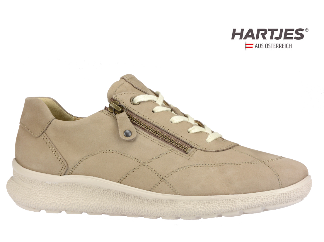 Deze sneakers van Hartjes zijn gemaakt van suede in de kleur beige. Dit model Rap van het merk Hartjes heeft een rits met functionele vetersluiting. Daardoor zijn ze eenvoudig aan en uit te trekken. Een ander voordeel van de hartjes schoenen is dat ze heel licht van gewicht zijn. Daardoor loopt u er zo op weg. De schoen is gemaakt op een wijdte K, waardoor deze heel geschikt is voor de bredere voet.