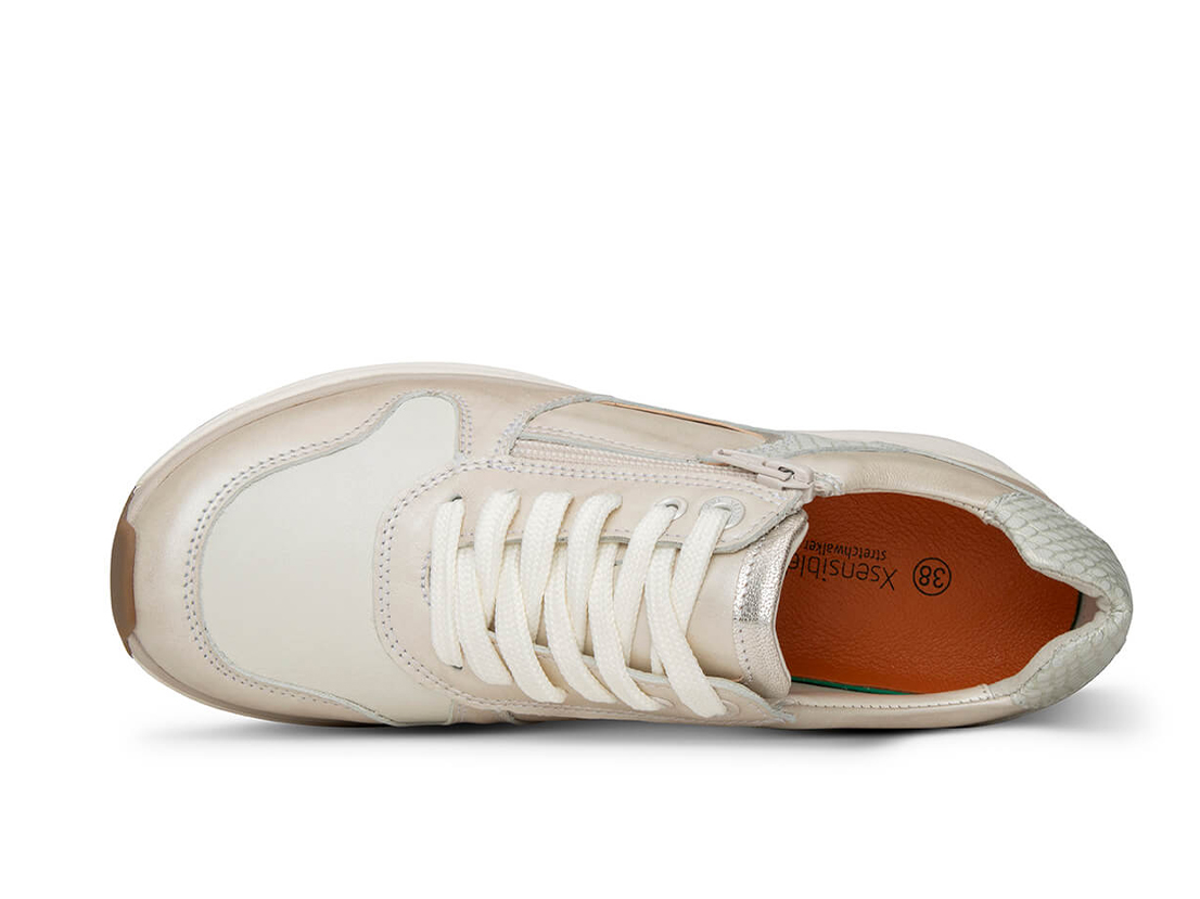 Deze sneaker in breedte G heeft een sportieve en dynamische uitstraling. In klassieke kleuren en hoogwaardig glad leer of als stijlvolle suède variant zal hij comfortbewuste trendsetters zeker aanspreken. De opnieuw verbeterde, tweekleurige zool biedt niet alleen ondersteuning, maar ook stabiliteit. Uitgevoerd in trendy kleuren voor een subtielere uitstraling: deze sneakers laten geen modewens onvervuld. Functionaliteit en comfort zijn perfect geïntegreerd in het eigentijdse design van deze schoen. De nieuwe verbeterde zool heeft alles wat Xsensible-schoenen zo comfortabel maakt: de bewezen Xsensible balanstechnologie, die altijd en overal een superieure loopervaring garandeert – dankzij de gewelfde voorvoet en de optimale demping. Deze stijlvolle sneakers zijn uiteraard uitgevoerd met stretchleer of hightech stretchmateriaal – afhankelijk van het model – bij de voorvoet.